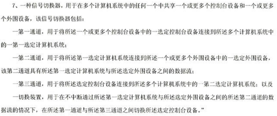 第三,从发明目的来看,本专利所要解决的技术问题是提供一种信号切换器,其在将一个或多个外围设备切换到不同的计算机系统的同时,不中断流向所述一个或多个外围设备的数据流。而对比文件1所要解决的技术问题是提供在多个USB主机之间共享外围设备,允许多个用户使用键盘、监视器、鼠标和一组USB外围设备的同时访问多个计算机,而且同时支持计算机之间的文件传送装置,因此,D1中没有给出关于上述区别技术特征的任何技术启示。